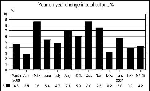 The volume of total output was 4.2 per cent greater in March 2001 than in March 2000. In February, output grew by 3.9 per cent from the previous year. The Monthly Indicator of Total Output of Statistics Finland indicates that, of the main branches of industry, the brisk growth of the economy was sustained by manufacturing in March.