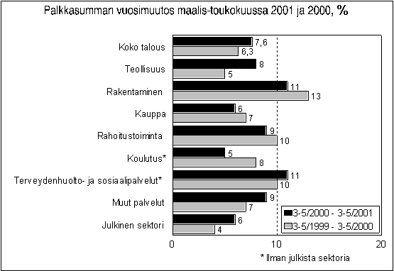 Teollisuusyritysten maksama palkkasumma oli toukokuussa päättyneellä kolmen kuukauden ajanjaksolla 8 prosenttia suurempi kuin vuotta aiemmin. Vuonna 2000 vastaava kasvu oli 5 prosenttia. Kasvu nopeutui etenkin puu- ja paperiteollisuudessa, jossa kasvu oli nyt 12 prosenttia ja vuotta aiemmin 2 prosenttia. Toimialan vertailutaso oli huhtikuulle 2000 ajoittuneen lakon vuoksi tavanomaista alempi. Rakentamisessa palkkasumma oli tarkasteluajanjaksona 11 prosenttia edellisvuotista suurempi. Vuotta aiemmin kasvu oli 13 prosenttia. Talonrakentamisen palkkasumma oli 12 ja maa- ja vesirakentamisen palkkasumma 6 prosenttia edellisvuotista suurempi.
