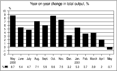 The volume of total output was 0.7 per cent smaller in May 2001 than in May 2000. The fall partly reflects the strong, 8.7 per cent growth of total output that was recorded in May 2000. Nevertheless, the Monthly Indicator of Total Output of Statistics Finland indicates that over the January to May 2001 period, total output went up by 2.8 per cent in all when compared to the corresponding time period in 2000. Output fell in May in four out of the six main industries of the Monthly Indicator. The only industry that showed clear growth was government and other services. A fall was last recorded in monthly total output in March 1996.