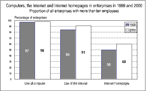 Last year 60 per cent of enterprises employing more than ten persons had Internet homepages of their own, while the year before this was the case for 50 per cent of enterprises of the same size. The use of the Internet in enterprises increased from 84 to 91 per cent. These data appear from the report Internet use and e-commerce in enterprises 2001 published by Statistics Finland. The data were collected by an inquiry in spring 2001.