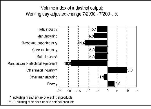 In July output in the wood and paper industry decreased by nearly 12 per cent from the year before. Output in the chemical industry fell by 6.5 per cent and in other manufacturing by 1.5 per cent. Energy production grew by almost 4 per cent from July 2000.