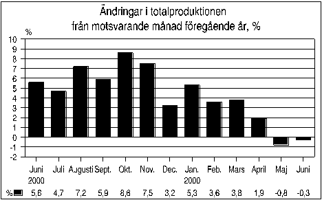 I juni 2001 var totalproduktionen 0,3 procent lägre än i juni år 2000. Enligt Statistikcentralens månadsgraf över totalproduktionen sjönk produktionen i juni inom fyra av sex huvudnäringsgrenar. Näringsgrenen handel samt offentliga och övriga tjänster ökade klart. Enligt månadsgrafen har totalproduktionen ökat med totalt 2,2 procent under januari-juni år 2001 jämfört med motsvarande period i fjol.