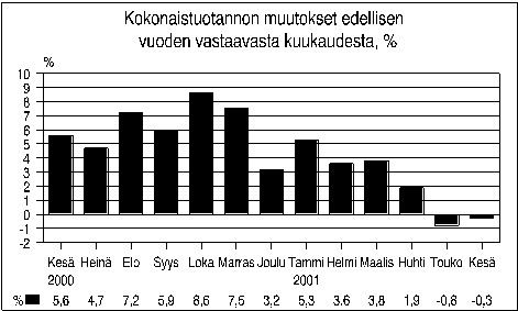 Kokonaistuotannon määrä oli vuoden 2001 kesäkuussa 0,3 prosenttia pienempi kuin viime vuoden kesäkuussa. Tilastokeskuksen laskeman kokonaistuotannon kuukausikuvaajan kuudesta päätoimialasta neljän päätoimialan tuotanto laski kesäkuussa. Kaupan sekä julkisten ja muiden palvelujen toimialat kasvoivat selvästi. Kokonaistuotanto on kasvanut kuukausikuvaajan mukaan vuoden 2001 tammi-kesäkuussa yhteensä 2,2 prosenttia edellisvuoden vastaaviin kuukausiin verrattuna.