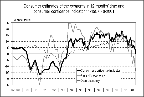 In August 41 per cent of consumers estimated that Finland's economic situation would worsen during the next 12 months, while 15 per cent thought it would improve. The corresponding proportions were 37 and 17 per cent in July, and 12 and 35 per cent in August 2000. Only 10 per cent of consumers thought their own economic situation would deteriorate. As many as before, or 26 per cent, were confident that their own economic situation would improve.