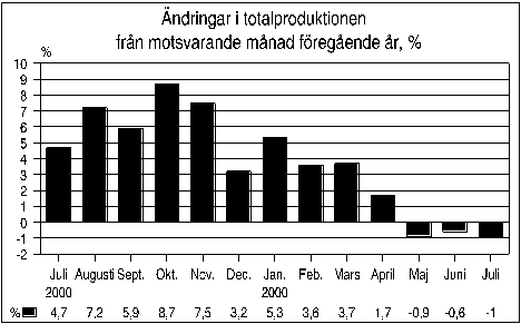 I juli 2001 var volymen av totalproduktionen 1,0 procent mindre än i juli i fjol. Av de sex huvudsakliga näringsgrenarna i Statistikcentralens månadsgraf över totalproduktionen minskade produktionen i juli inom två, dvs. inom industrin och byggverksamheten. Däremot ökade produktionen tydligt inom jord- och skogsbruk, samfärdsel samt offentliga och övriga tjänster. Enligt månadsgrafen har totalproduktionen under januari-juli 2001 ökat totalt med 1,6 procent jämfört med motsvarande månader föregående år.