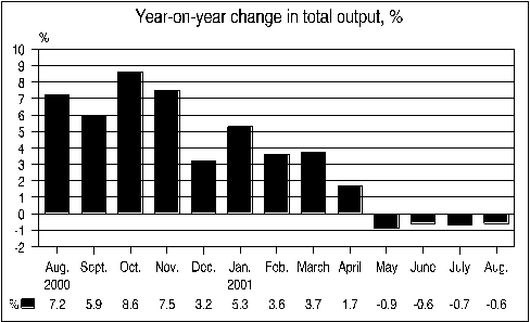 The volume of total output was 0.6 per cent smaller in August 2001 than in August 2000. Output fell in August in four of the six main industries, i.e. primary production, manufacturing, construction and trade, included in the Monthly Indicator of Total Output calculated by Statistics Finland. The industry of public services and other services continued to grow. Output in transport was unchanged from August 2000. According to the Monthly Indicator, total output has increased in all by 1.4 per cent during the January to August period this year when compared to the corresponding months last year.