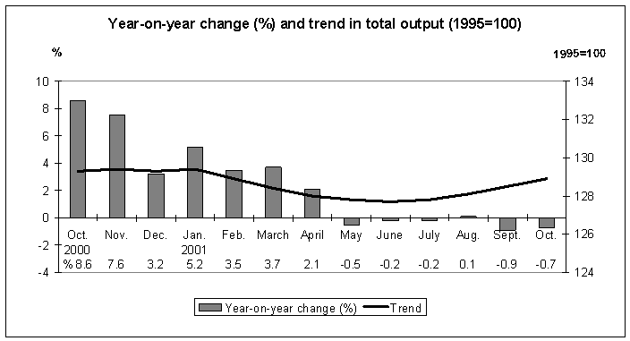 Total output fell by 0.7 per cent in October from one year ago