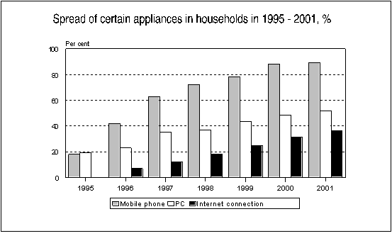 In August 2001, 52 per cent of all households in Finland had a home computer and 36 per cent had an Internet connection. In two years, the proportion of households with an Internet connection grew by only good 10 percentage points. However, missing home connections could be compensated with connections at work or place of study, for in autumn 2000 as many as 60 per cent of all 15-74-year-olds were already able to use the Internet at home, work, place of study or elsewhere. Nine out of ten households in Finland had a mobile phone. These data originate from Statistics Finland's publication On the Road to the Finnish Information Society III.