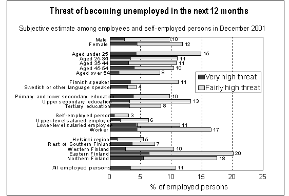 In December 45 per cent of consumers estimated that unemployment will start to increase this year. The corresponding proportion was 54 per cent in November. Just 11 per cent of employed persons assumed themselves to become unemployed in 2002. Under 25-year-olds, persons with Upper secondary education, workers and those living in Northern and Eastern Finland were most worried about becoming unemployed. Consumers estimated that inflation would be 2.5 per cent in this year's December.