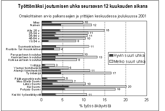 Kuluttajista 45 prosenttia arvioi joulukuussa, että työttömyys alkaa lisääntyä tänä vuonna. Vastaava osuus oli marraskuussa 54 prosenttia. Työssäkäyvistä vain 11 prosenttia arveli työttömyyden osuvan vuonna 2002 omalle kohdalleen. Eniten työttömäksi jäämistä pelkäsivät alle 25-vuotiaat, keskiasteen koulutuksen saaneet, työntekijät sekä Pohjois- ja Itä-Suomessa asuvat. Kuluttajat ennustivat inflaation olevan tämän vuoden joulukuussa 2,5 prosenttia.