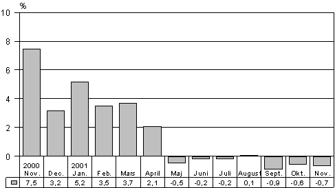 I november 2001 var volymen av totalproduktionen 0,7 procent mindre än i november 2000. Av de sex huvudsakliga näringsgrenarna i Statistikcentralens månadsgraf över totalproduktionen minskade produktionen inom tre, dvs. inom primärproduktionen, industrin och byggverksamheten. Däremot ökade produktionen inom handeln, offentliga och övriga tjänster samt samfärdseln. Totalproduktionen ökade under januari-november 2001 totalt med en procent jämfört med motsvarande period året förut. Jämfört med oktober ökade den säsongutjämnade totalproduktionen något i november.