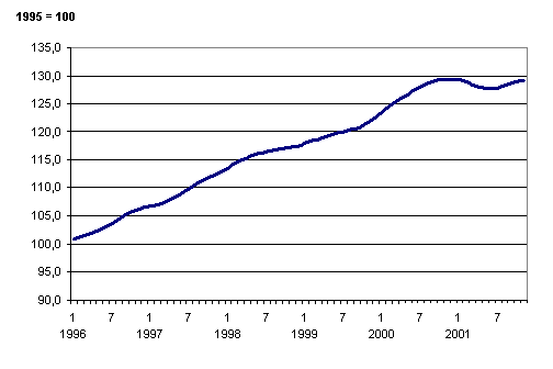 I november 2001 var volymen av totalproduktionen 40 procent större än under depressionens botten i mars 1993 och 19 procent större än under toppen av högkonjunkturen före depressionen, dvs. i december 1989. Från år 1995 till november 2000 ökade totalproduktionen med 29 procent. Efter lågkonjunkturen våren 2001 verkar totalproduktionen nu i november 2001 ha uppnått samma nivå.