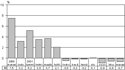 Kokonaistuotannon määrä oli vuoden 2001 marraskuussa 0,7 prosenttia edellisvuoden marraskuuta pienempi. Tilastokeskuksen laskeman kokonaistuotannon kuukausikuvaajan kuudesta päätoimialasta kolmen eli alkutuotannon, teollisuuden ja rakentamisen tuotanto supistui. Kaupan, julkisten ja muiden palvelujen sekä liikenteen toimialat kasvoivat. Kokonaistuotanto kasvoi vuoden 2001 tammi-marraskuussa yhteensä prosentin edellisvuoden vastaaviin kuukausiin verrattuna. Kausitasoitettu kokonaistuotanto kasvoi marraskuussa hieman lokakuuhun verrattuna.