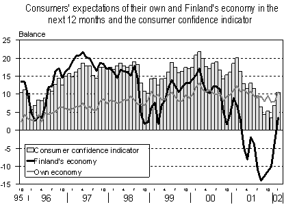 In January 30 per cent of consumers expected Finland's economic situation to improve this year while 23 per cent estimated the country's economy to deteriorate further. The corresponding proportions for December were 24 and 29 per cent. Optimists have last outnumbered pessimists in February 2001. In January a few percentage points more than in December believed that their own economic situation would improve, that is, 27 per cent of consumers. Only 9 per cent of consumers were concerned that their own economic situation would worsen this year.