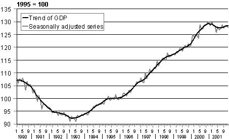 Volume of GDP in 1990-2001, trend and seasonally adjusted series