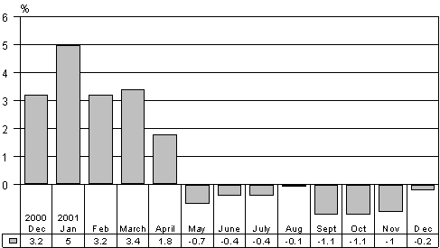 In December 2001, GDP fell by only 0.2 per cent from the previous year's December. Output fell in four of the six main industries, i.e. primary production, manufacturing, construction and transport compared to December 2000. The industries of trade and public services and other services grew.