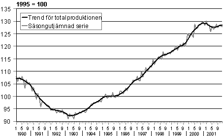 Volymen av totalproduktionen 1990-2001, trend och säsongutjämnad serie