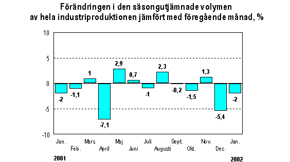 Enligt Statistikcentralen var den säsongutjämnade produktionen i januari 2 procent mindre än i december. I december minskade industriproduktionen med 5,4 procent jämfört med november. Den säsongutjämnade produktionen ökade senast i november, då den var 1,3 procent större än i oktober.