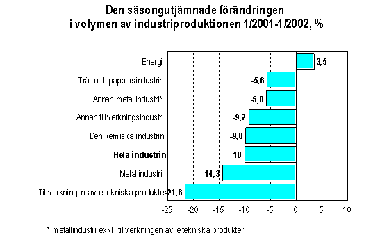 Jämfört med januari i fjol minskade den säsongutjämnade industriproduktionen med 10 procent. Jämfört med ett år tidigare minskade industriproduktionen i januari inom nästan alla huvudnäringsgrenar. Produktionen inom den elektroniska industrin minskade med nästan 22 procent och produktionen inom den kemiska industrin med nästan 10 procent. Inom trä- och pappersindustrin minskade produktionen med nästan 6 procent. Ett undantag var energiförsörjningen, där produktionen ökade med 3,5 procent.