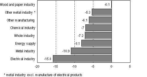 Compared to last year's February, seasonally adjusted industrial output went down by 7.2 per cent. Industrial output declined in February in nearly all of the main industries from the year before. Output in the metal industry fell by close on 11 per cent. Within the metal industry, output in the electrical industry declined by almost 16 per cent. In the chemical industry output decreased by 7 per cent. In the wood and paper industry output fell by only 0.1 per in February.