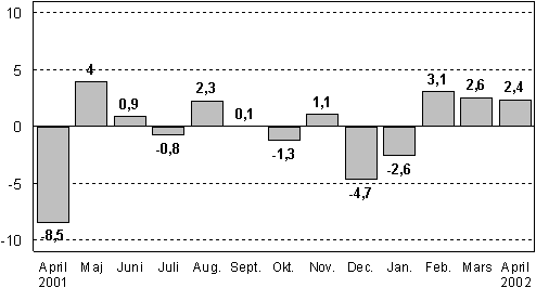 Den procentuella säsongrensade förändringen i volymen av industriproduktionen 4/2001-4/2002