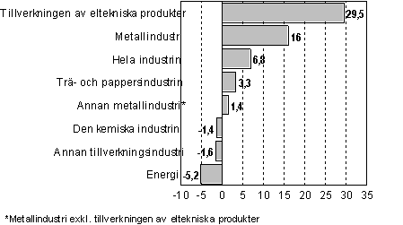 I april ökade industriproduktionen inom flera huvudsakliga näringsgrenar jämfört med året förut. Tillverkningen av eltekniska produkter ökade rentav med närmare 30 procent. Inom trä- och pappersindustrin ökade produktionen från året innan med mer än 3 procent. Produktionen inom den övriga metallindustrin ökade med något över en procent. Produktionen minskade inom den kemiska industrin med 1,4 procent och inom den övriga fabriksindustrin med 1,6 procent.
