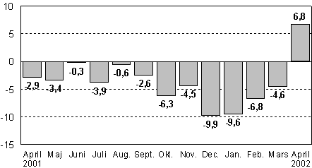 Jämfört med april i fjol ökade den säsongrensade industriproduktionen med 6,8 procent. Föregående gång ökade produktionen från föregående år i mars 2001. Med andra ord beror de höga tillväxtsiffrorna i april delvis på produktionsnedgången under jämförelseperioden.