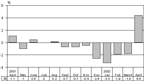 In April 2002, GDP rose by 4.4 per cent compared to the previous year's April. Output grew in all of the six main industries, i.e. primary production, manufacturing, construction, trade, transport, and public services and other services.