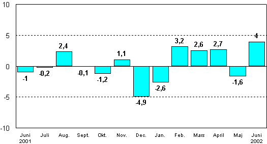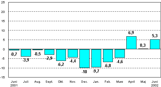 Jämfört med juni 2001 ökade den säsongrensade industriproduktionen med 5,3 procent. Under perioden från januari till juni minskade dock den säsongrensade industriproduktionen med 1,6 procent jämfört med motsvarande period förra året.