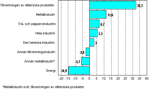 Industriproduktionen ökade alltjämt inom flera näringsgrenar jämfört med juni i fjol. Mest ökade produktionen av eltekniska produkter, med drygt 32 procent. Inom trä- och pappersindustrin ökade produktionen med nästan 7 procent. Även inom den kemiska industrin ökade produktionen med tre procent från året innan. Produktionen minskade mest inom energiförsörjningen, med nästan 15 procent. Nedgången i energiproduktionen förklaras delvis av den ökade importen.