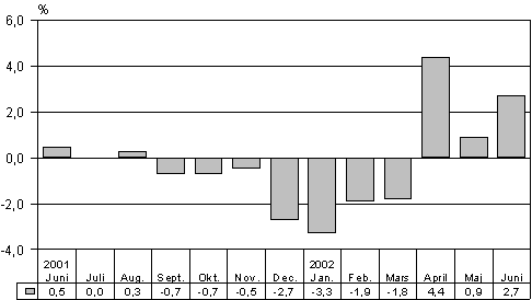 I juni 2002 ökade totalproduktionen med 2,7 procent jämfört med juni året innan. Av de sex huvudsakliga näringsgrenarna inom månadsgrafen ökade produktionen inom fyra, dvs. inom primärproduktionen, industrin, handeln samt inom offentliga och övriga tjänster. Samfärdseln och byggverksamheten avtog.