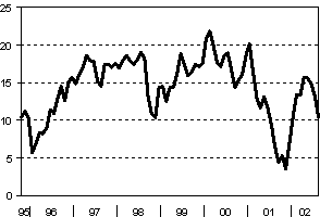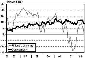 Consumers' expectations concerning their own and Finland's economy in twelve months' time 10/1995-8/2002