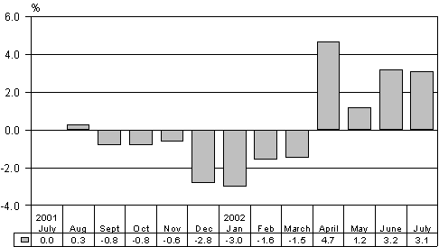 In July 2002, GDP rose by 3.1 per cent compared to the previous year's July. Output grew in four of the six main industries, i.e. manufacturing, trade, transport, and public services and other services. In contrast, primary production and construction fell.