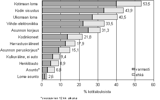 Kuluttajabarometrillä mitattavat kotitalouksien ostoaikeet kasvoivat vahvasti 1990-luvun jälkipuoliskolla laman jälkeen. Parin viime vuoden aikana kasvu on tasaantunut. Henkilöauton, huonekalujen, viihde-elektroniikan ja harrastusvälineiden hankinta-aikeet ovat olleet pari vuotta suunnilleen ennallaan. Kodinkoneiden ostoaikeet ovat jopa hieman laskeneet. Asunnon hankinta-aikeiden lisäksi vain remontti- ja kotimaan lomasuunnitelmat olivat korkeammalla kuin edellisinä vuosina vastaavaan aikaan.