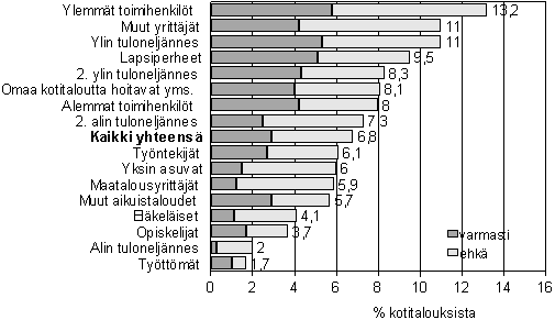 Omistusasunnon hankinta-aikeita oli väestöryhmistä eniten ylemmillä toimihenkilöillä, yrittäjillä ja ylimmällä tuloneljänneksellä. Näistä talouksista useampi kuin joka kymmenes aikoi ostaa omistusasunnon vuoden sisällä. Vähiten ostoaikeita oli alimman tuloneljänneksen ja työttömien talouksilla, opiskelijoilla ja eläkeläisillä. Lapsiperheistä asunnon hankkimista suunnitteli 9,5 prosenttia, kun taas yksin asuvista ja kahden tai useamman aikuisen talouksista samaa aikoi noin 6 prosenttia.
