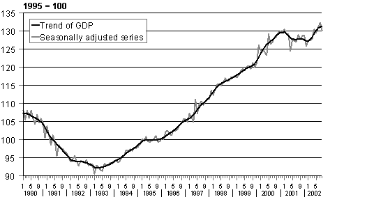 Volume of GDP in 1990-2002, trend and seasonally adjusted series