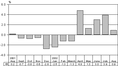 In August 2002, GDP increased by 0.9 per cent compared to the previous year's August. Output grew in four of the six main industries, i.e. manufacturing, trade, transport, and public services and other services. In contrast, primary production and construction contracted.