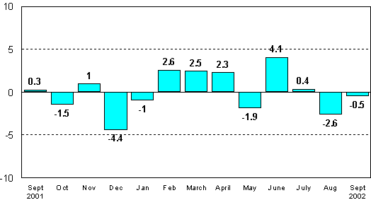 Compared to September 2001, seasonally adjusted industrial output grew by 0.8 per cent. Over the January to September period, seasonally adjusted industrial output was 0.9 per cent higher than over the corresponding period of last year.