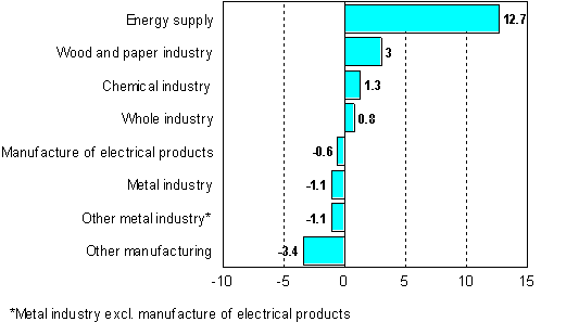 In September output increased most, or by as much as 32.4 per cent, in mining and quarrying. Energy production also went up by 12.7 per cent from the year before. In the wood and paper industry, output increased by 3 per cent and in the chemical industry by good one per cent. In contrast, output of electrical products decreased by just short of one per cent from last year's September. Compared to twelve months back, output fell by 3.4 per cent in other manufacturing and by 1.1 per cent in other metal industry.