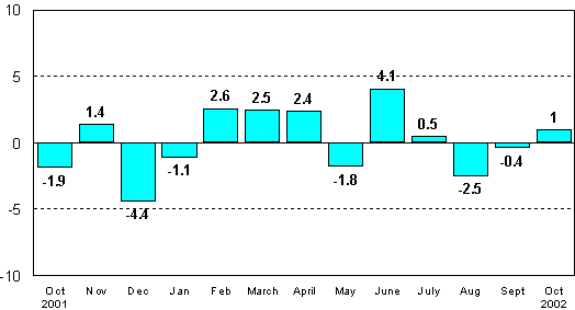 Compared to October 2001, seasonally adjusted industrial output grew by 3.9 per cent. Over the January to October period, seasonally adjusted industrial output was 1.2 per cent higher than over the corresponding period of last year.
