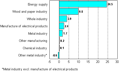 In October output increased most, or by 24.5 per cent, in energy supply. Output in the wood and paper industry went up by close on 10 per cent. Good 2 per more electrical products were manufactured than in the previous year's October. In other manufacturing and in the chemical industry output rose slightly compared to 12 months back.