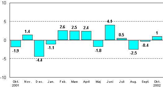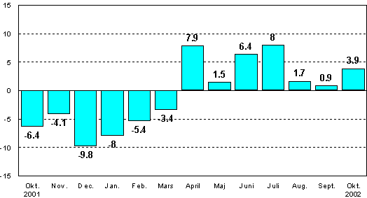 Jämfört med oktober 2001 ökade den säsongrensade industriproduktionen med 3,9 procent. Under januari-oktober var den säsongrensade industriproduktionen 1,2 procent större än under samma period i fjol.