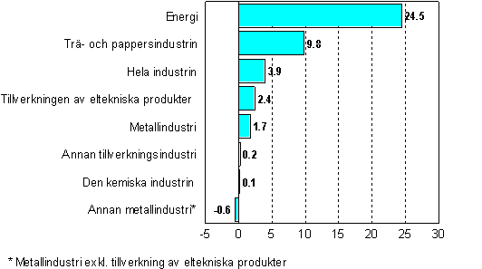 I oktober ökade produktionen mest inom energiförsörjning, dvs. med 24,5 procent. Inom trä- och pappersindustrin ökade produktionen med närmare 10 procent. Tillverkningen av eltekniska produkter ökade med drygt 2 procent från oktober i fjol. Produktionen inom den övriga fabriksindustrin och inom den kemiska industrin ökade något från året innan.