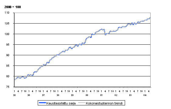 Kokonaistuotannon määrä 1995 - 2004, trendi ja kausitasoitettu sarja