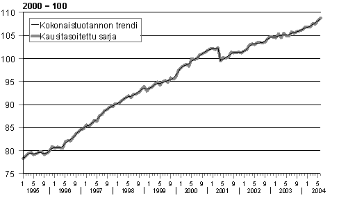 Kokonaistuotannon määrä nousi 5,0 prosenttia vuoden 2004 kesäkuussa edellisvuoden kesäkuuhun verrattuna. Kuukausikuvaajan kaikki kuusi päätoimialaa kasvoivat. Kesäkuussa työpäiviä oli yksi enemmän kuin edellisvuoden vastinkuukaudessa. Kokonaistuotanto kasvoi selvästi myös työpäiväkorjattuna.