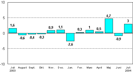 I juli 2004 var den säsongrensade industriproduktionen enligt Statistikcentralen 3 procent större än i juni. Den ursprungliga produktionsvolymen ökade med 5 procent jämfört med juli 2003. Den ursprungliga produktionsvolymen ökade i januari-juli med 3,1 procent jämfört med motsvarande tidpunkt i fjol.