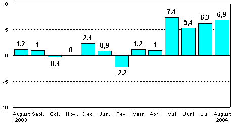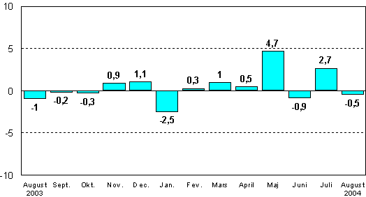 Enligt Statistikcentralen var den säsongrensade industriproduktionen i augusti 2004 en halv procent mindre än i juli. Den ursprungliga produktionsvolymen ökade med nästan 9 procent jämfört med augusti 2003. Under januari-augusti ökade den ursprungliga produktionsvolymen med 3,8 procent från motsvarande period i fjol.