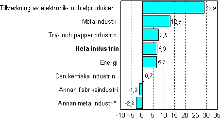 I augusti 2004 ökade den säsongrensade industriproduktionen med 6,9 procent från augusti 2003. Produktionen ökade mest inom tillverkningen av elektronik- och elprodukter, dvs. med närmare 29 procent. Den kraftiga tillväxten inom elektronikindustrin höjde hela metallindustrin till en ökning av nästan 13 procent. Produktionen inom trä- och pappersindustrin ökade med 7,5 procent.
