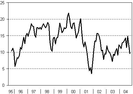 | Lokakuu 2004 saldoluku | Syyskuu 2004 saldoluku | Lokakuu 2003 saldoluku | Keskiarvo 10/95-10/04 | |||||