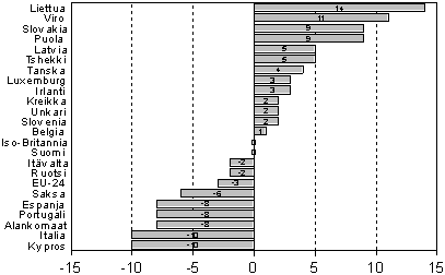 Indikaattorin poikkeama maan keskiarvosta 10/1995-9/2004*
